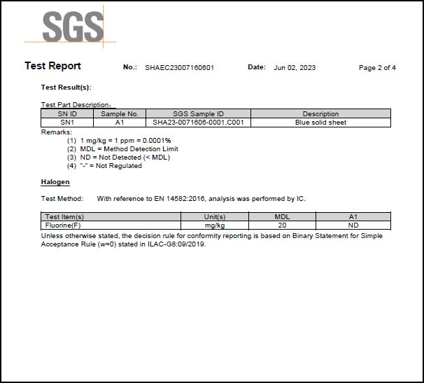 為滿足客戶需求,近日SealTex索 ST-2058無石棉板通過了SGS進(jìn)行的鹵素(氟)檢測,檢測標(biāo)準(zhǔn)EN 14582-2016,報告顯示未測出氟,報告部分截圖如下: